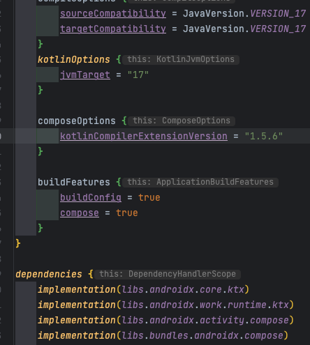 composeOptions는 Jetpack Compose를 사용할 때, Android Gradle 플러그인에 대한 추가 설정을 제공하는 데 사용되는 Gradle DSL 블록이다. Compose와 관련된 구성 옵션을 지정할 때 사용한다.