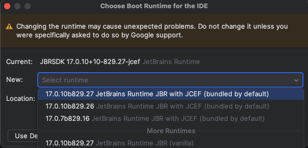 최신버전 JetBrains Runtime JBR with JCEF 선택 -> OK
